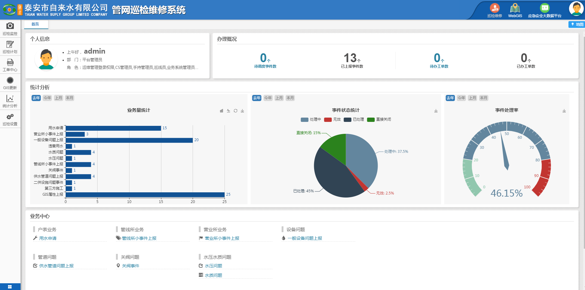 ????????管線信息數(shù)據(jù)是整個系統(tǒng)的核心,系統(tǒng)的各種功能依托于底層最基礎的數(shù)據(jù)。2020年6月初至2021年4月8日,GIS平臺共錄入管線697.284公里,錄入設備共24673個,其中包括消防栓1932個、三通4703個、閥門3615個、水表661個、排氣閥321個、四通104個、其他設備13337個。據(jù)統(tǒng)計,泰城市政道路供水主管線約760公里,還有近70公里數(shù)據(jù)未進行錄入,目前數(shù)據(jù)補錄正在進行中。