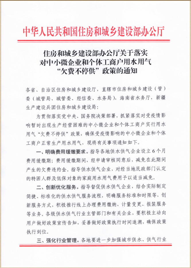 您當(dāng)前位置》政策法規(guī)》關(guān)于貫徹落實(shí)《住房和城鄉(xiāng)建設(shè)部辦公廳關(guān)于落實(shí)對(duì)中小微企業(yè)和個(gè)體工商用戶用水用氣“欠費(fèi)不停供”政策的通知》的通知